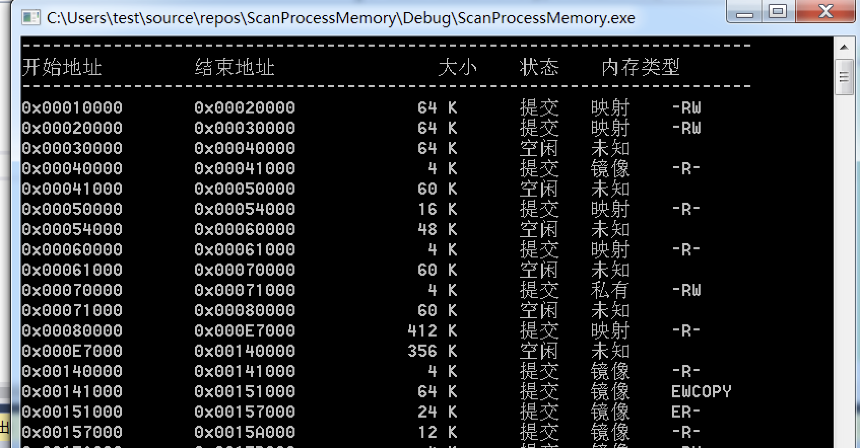 printf("------------------------------------------------------------------------ \n"); printf("开始地址 \t 结束地址 \t\t 大小 \t 状态 \t 内存类型 \n"); printf("------------------------------------------------------------------------ \n"); while (pAddress < (PBYTE)sysinfo.lpMaximumApplicationAddress) { ZeroMemory(&mbi, sizeof(MEMORY_BASIC_INFORMATION)); stSize = VirtualQueryEx(hProc, pAddress, &mbi, sizeof(MEMORY_BASIC_INFORMATION));