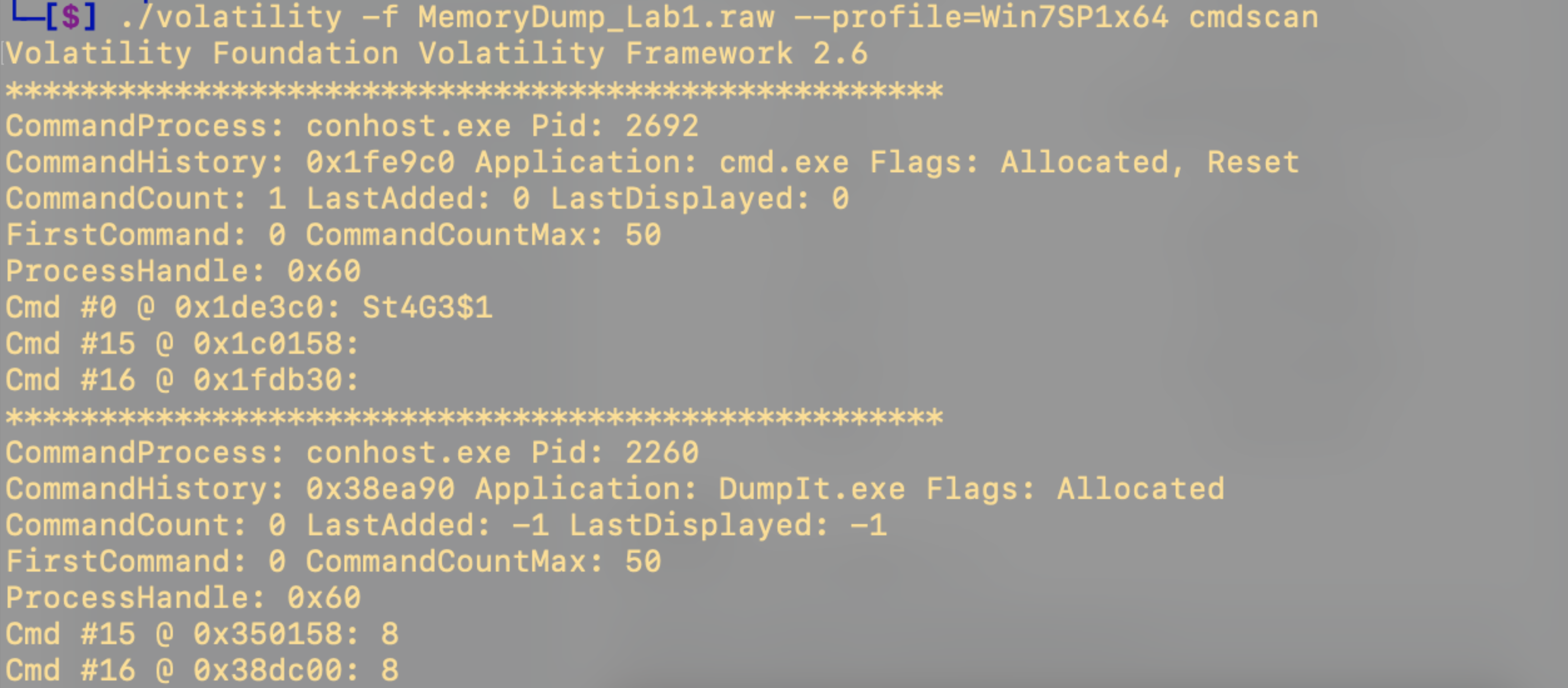 ./volatility -f MemoryDump_Lab1.raw —profile=Win7SP1x64 cmdscan