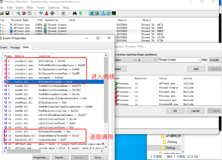 使用process monitor 查看该进程调用过程 从CreateThread ->