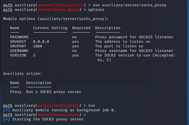 msf6 auxiliary(server/socks_proxy) > use 0 msf6 post(multi/recon/local_exploit_suggester) > options